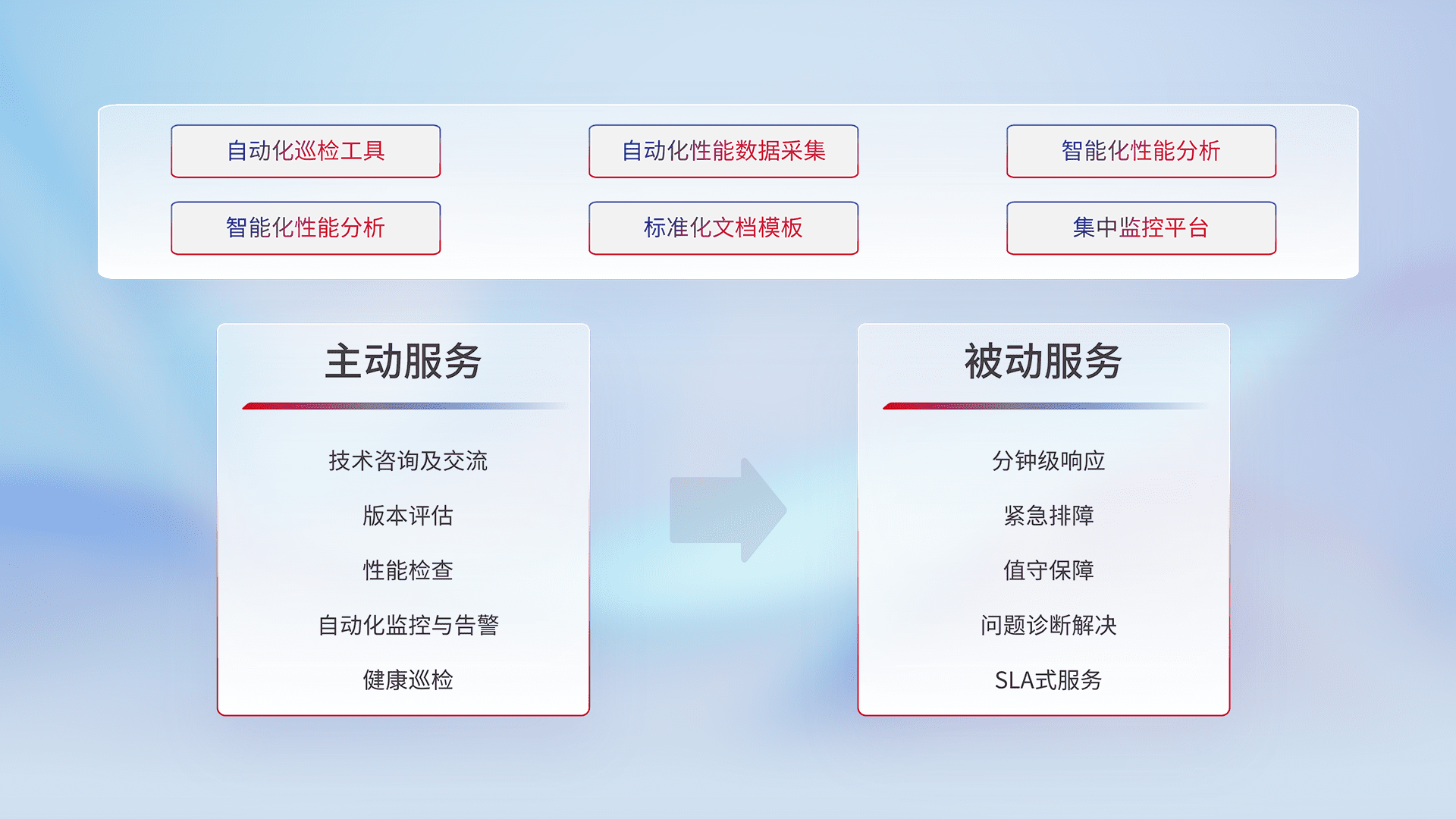 智能化工具和标准化文档,,保障服务质量,,提供主动服务(包含技术咨询、、、、版本评估、、、、性能检查、、、、自动化监控与告警、、、、健康巡检)和被动服务包含(分钟级响应、、紧急排障、、、、值守保障、、、问题诊断解决、、、SLA服务)。。。